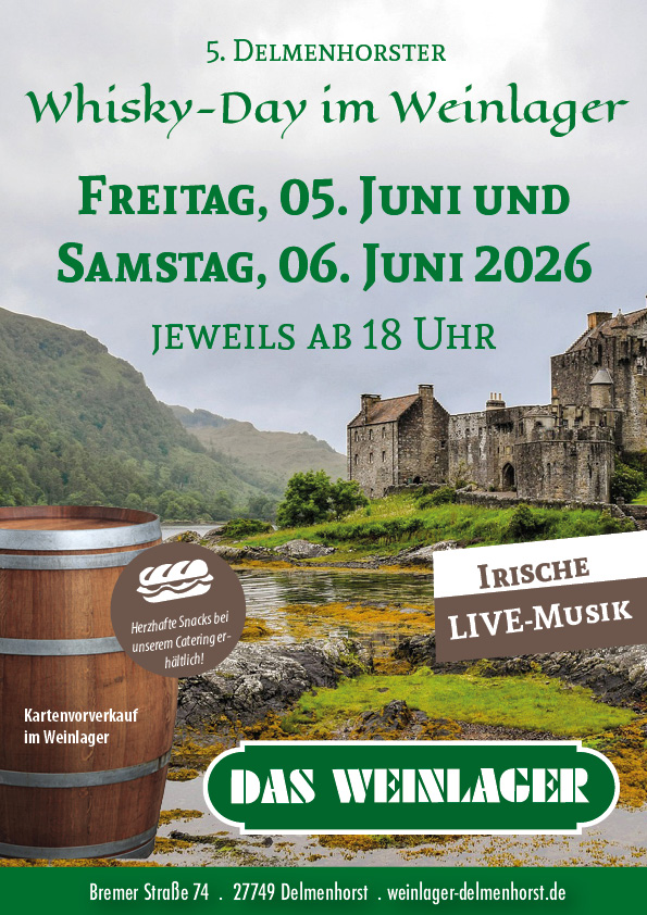 Der Termin für den 5.ten Delmenhorster Whisky – Day im Weinlager steht. Sichert euch eine Karte und seid dabei, wenn wir wieder unsere Tore öffnen, um mit euch zwei schöne Tage rund um den Whisky zu verbringen.